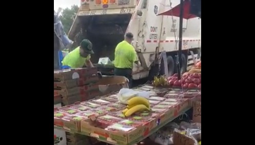 The video shows sanitation crews throwing box after box of fresh fruit and vegetables into a garbage truck from a stand on Pelham Parkway, with an angry crowd protesting the move.