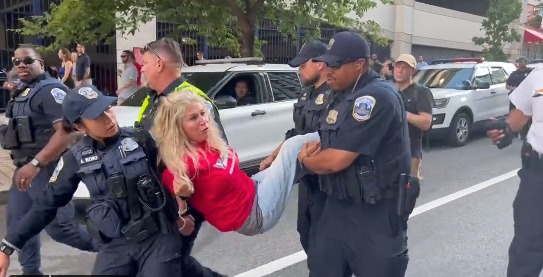Three protesters were busted for unlawful entry at the stadium when dozens of demonstrators blocked the entrance, the DC Metropolitan Police Department told Fox News.